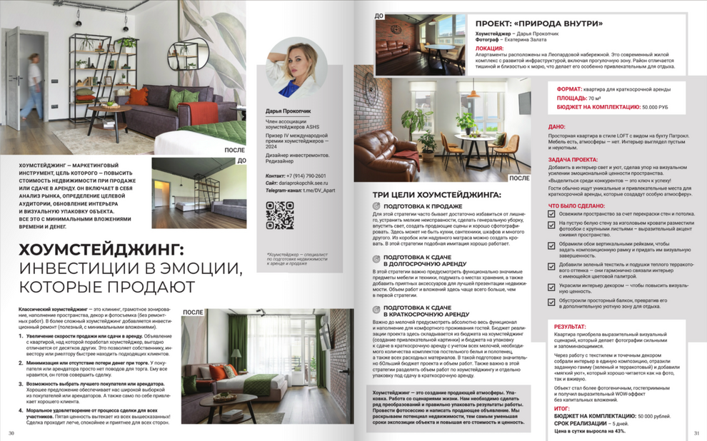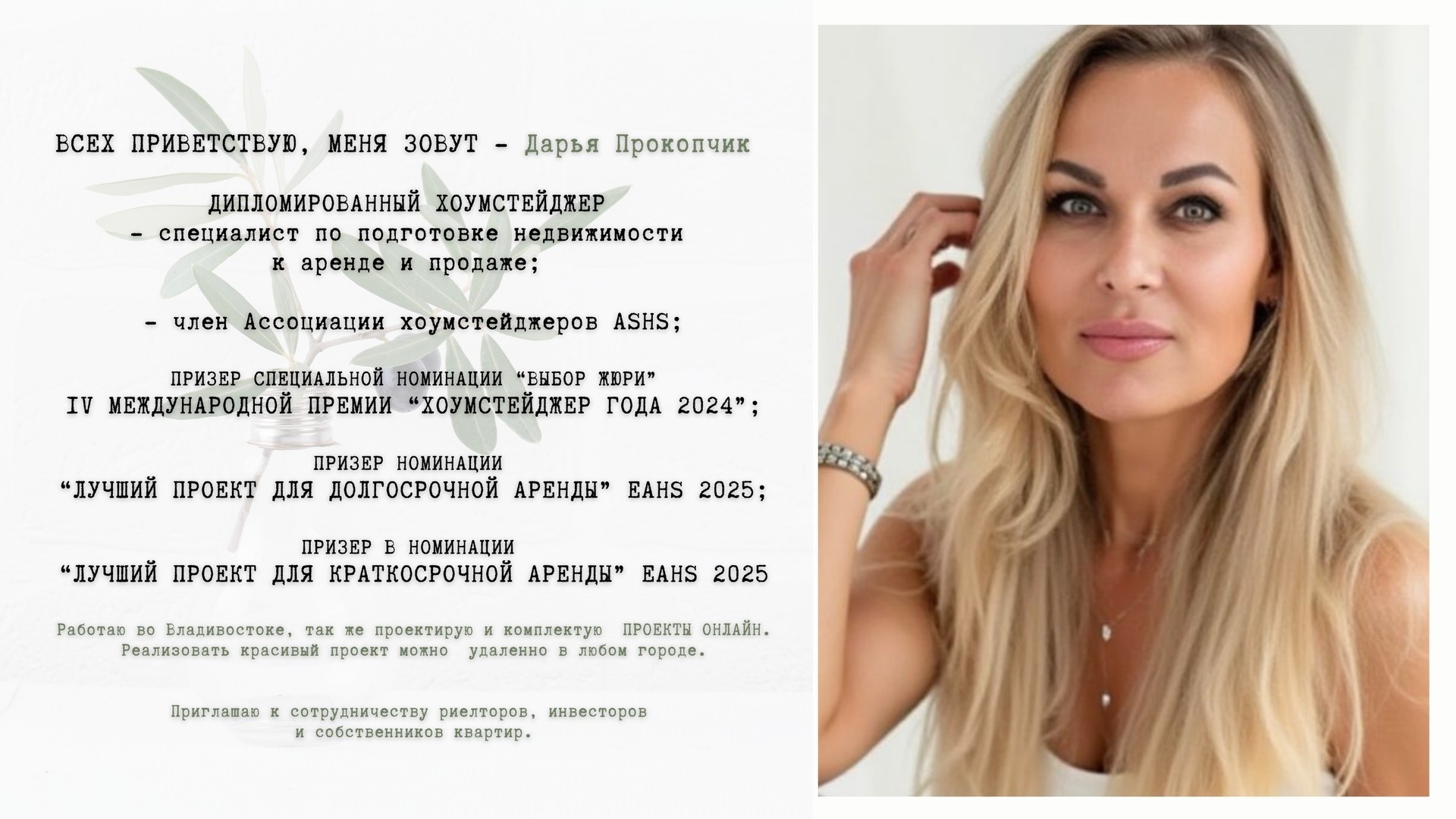 Обратилась к Дарье за фотостейджингом для квартиры, которую сдаю посуточно. Без глобальных изменений она придала интерьеру изюминку. Новые фото — просто вау! Бронирования выросли сразу после публикации. Очень довольна результатом!
