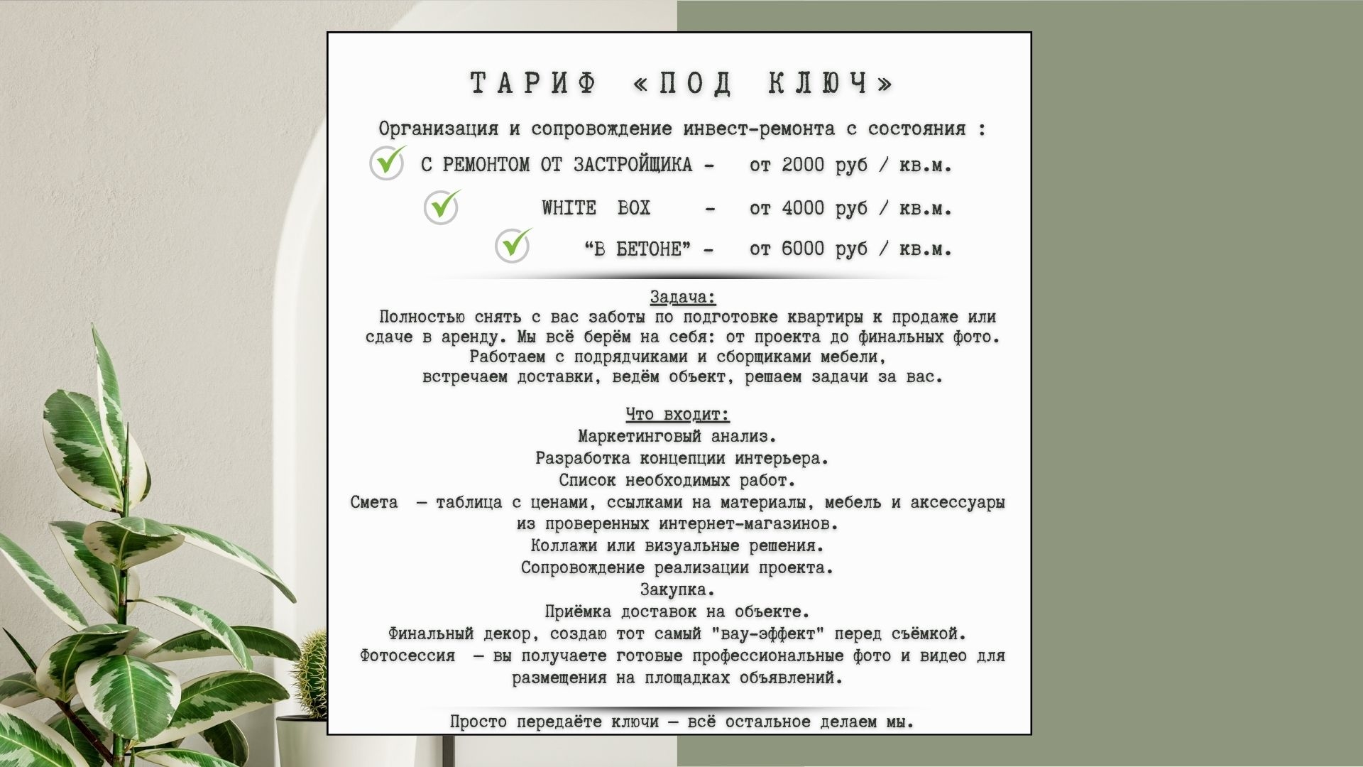 ИНВЕСТРЕМОНТ ДЛЯ ДОЛГОСРОЧНОЙ АРЕНДЫ. УПАКОВКА "ПОД КЛЮЧ"