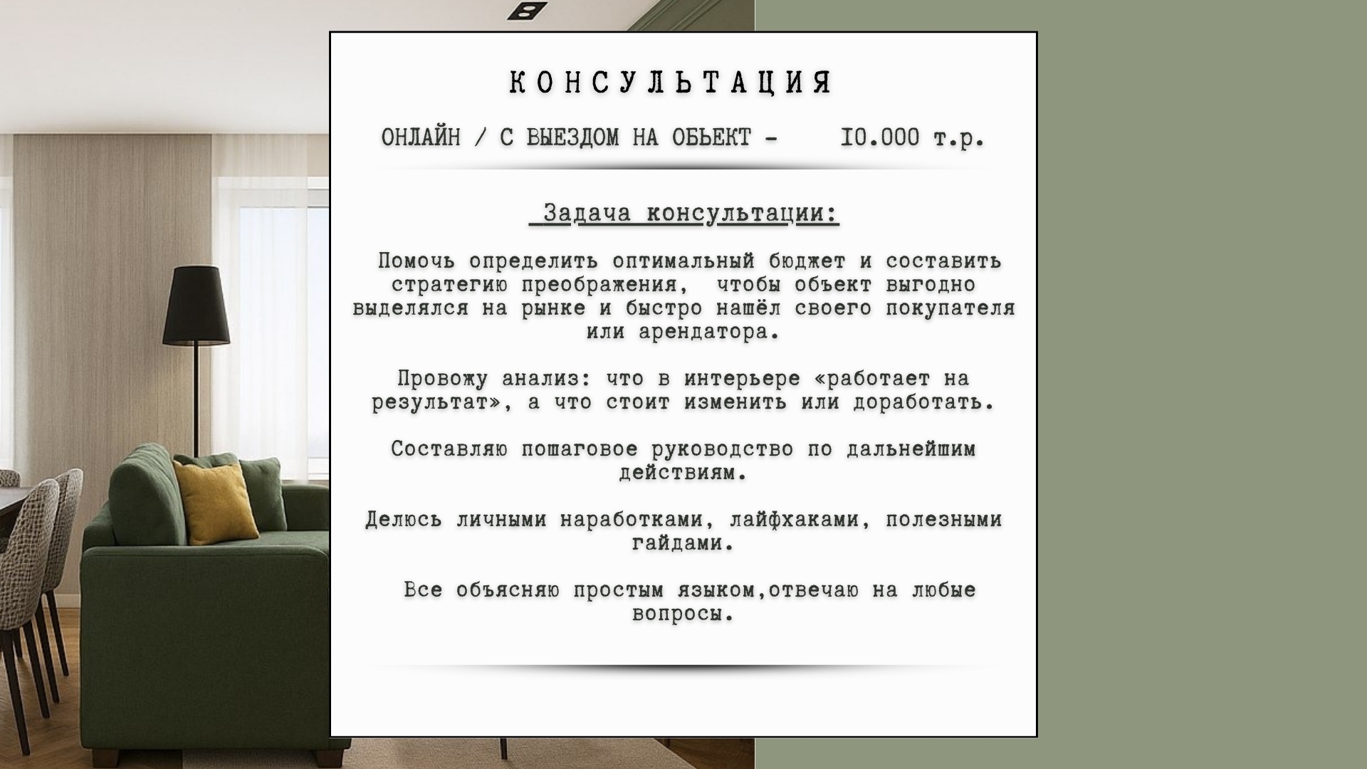 - выделить квартиру среди конкурентов, - подчеркнуть достоинства, - раскрыть потенциал, - сделать ее максимально привлекательной и конкурентоспособной для дальнейшей продажи или сдачи в аренду.