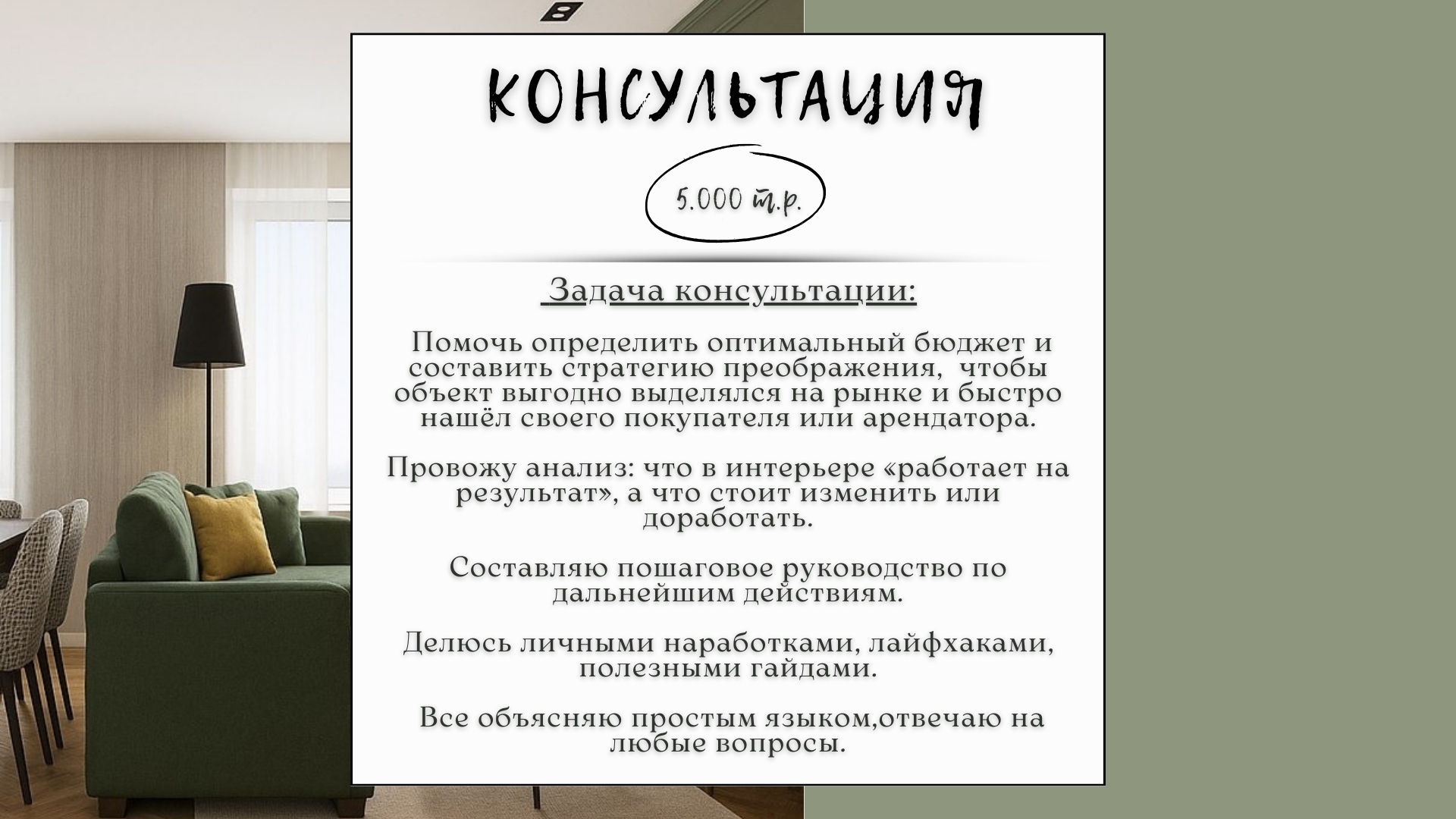 Хоумстейджинг — это забота о впечатлении. Это создание атмосферы, где хочется остаться. Создание продающей атмосферы. Упаковка. Работа со сценариями жизни. Нам необходимо сделать ряд преобразований и правильно упаковать результаты работы. Провести фотосессию и написать продающее обьявление.