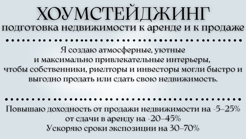 Продажа быстрее в 2–3 раза Цена выше на 5–35% Меньше торга, больше звонков Экономия вашего времени и бюджета Люди выбирают сердцем — и это работает Хоумстейджинг помогает показать не просто квадратные метры, а ощущение жизни.